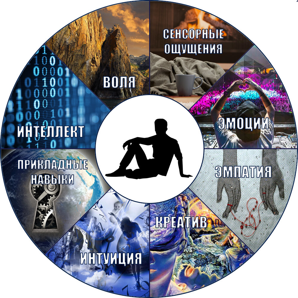 Как именно это связано с исследованиями, человеческим мозгом и прочими интересными штуками - мы расскажем в следующей статье, а пока что вы можете попробовать угадать свои способности - мысленно разделите картинку двумя линиями по диагонали крест-накрест. У вас получится 4 сектора по 2 сферы способностей. Теперь выберите любые четыре стоящие рядом друг с другом так, чтоб они заканчивались на границах диагональных линий.