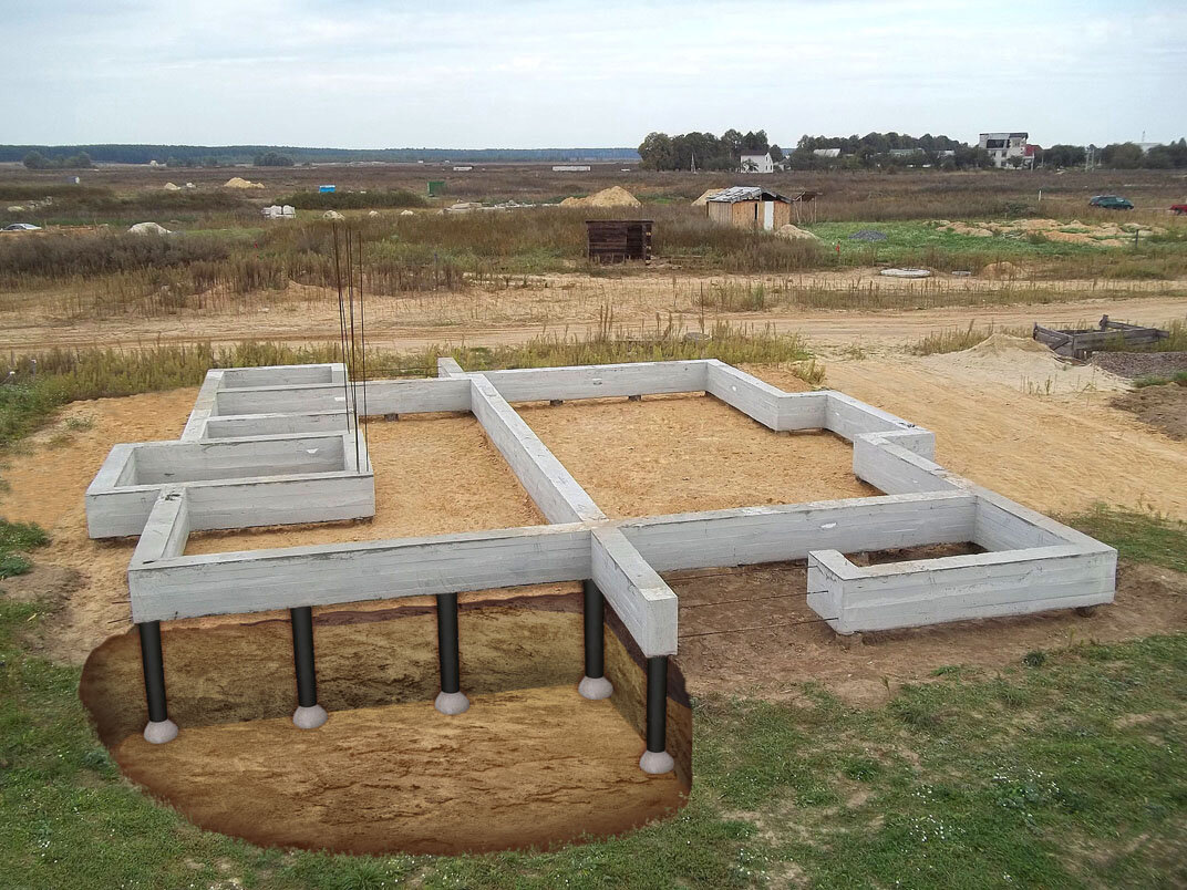 Этот вид фундамента наиболее подходит для слабоувлажненных грунтов, при условии, что при подготовке котлована не происходит просачивания воды. Такой фундамент не следует возводить на слабых грунтах, а также при строительстве тяжелых конструкций. Прежде всего, специальным буром выполняются отверстия имеющие глубину не меньше 1,7 метра. Окружность, образовавшейся скважины закрывается толевой рубашкой. Она позволяет предотвратить контакт фундамента и грунта. Перед выполнением заливки производится обязательное уплотнение грунта на дне скважины. В каждое отверстие вертикально устанавливается арматура. Далее выполняется опалубка (деревянный короб, труба соответствующего диаметра, возможно асбестовая) и бетонирование сваи. Может применяться бетон, железобетон. Наливной свайный фундамент характеризуется небольшой стоимостью, достаточной простотой в создании. В случае необходимости можно выполнить доливку ленты и превратить его в свайно-ленточный фундамент, характеризующийся более высокой степе