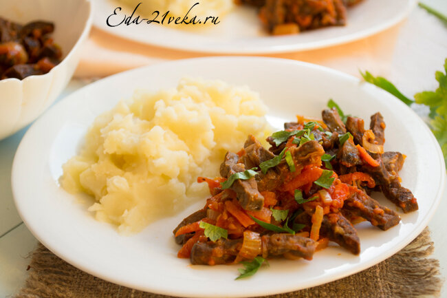 Жареное свиное лёгкое с луком, морковью и чесноком, тушеное в томатном соке.