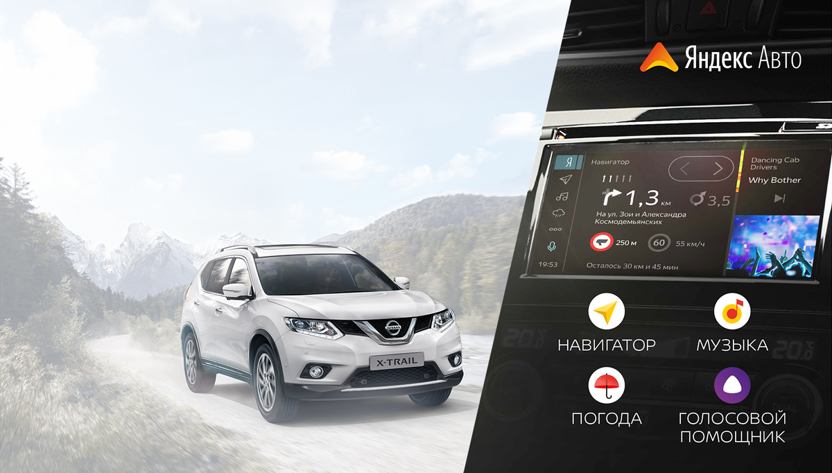 Японский Nissan совместно с российским IT-гигантом, компанией Яндекс, выпустила на рынок автомобили Nissan Qashqai и X-Trail со встроенной мульмимедийной системой Яндекс. Авто. Огромный 8-дюймовый сенсорный экран будет выводить все необходимые водителю и пассажирам сервисы, от навигационной системы Яндекс.Навигатор до стриминга Яндекс.Музыки и прогноза погоды и поиска информации в интернете. Система работает на современном четырехъядерном процессоре, оснащена 2 ГБ оперативной памяти. Есть возможность закачивать офлайн-карты на SD-носитель. Модуль высокоскоростной связи 4G обеспечит регулярное обновление всех предустановленных приложений, которые были специально адаптированы в единый графический интерфейс и имеют возможность индивидуальной настройки. Голосовой помощник уверенно распознает речь и позволяет управлять всеми встроенными в Яндекс.Авто сервисами, не отвлекая от дороги. Яндекс.Навгатор позволяет строить маршруты с учетом пробок, находить парковки и предупреждает о дорожных с