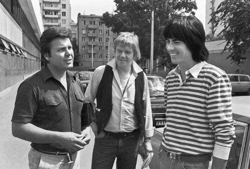 Лев Лещенко беседует с французскими музыкантами группы «Space» Яном Лозетом и Дидье Маруани . 1983 год. Фото Николая Малышева /Фотохроника ТАСС Карел Готт и Владимир Высоцкий в г. Дубулты (Латвия) Фото О. Мартинсона, 6 августа 1972 года (из архива Сергея Демина) Алла Пугачева и Джо Дассен. 1979 год. Фото Владимира Богатырева /РИА Новости/ София Ротару и группа Машина времени на съемках кинофильма «Душа», 1981 год Людмила Гурченко, Муслим Магомаев, Полад Бюль-Бюль Оглы на телевидении, 1970-е. Фото: Н. Свиридова и Д. Воздвиженский Анна Герман (в центре) в студии грамзаписи «Мелодия». 1975 год. Фото Бориса Ушмайкина/РИА Новости/ Валерий Леонтьев и Игорь Николаев. 1985 год. Автор фото Сергей Борисов Актриса Ленинградского театра музыкальной комедии Людмила Сенчина (слева) на занятиях в балетном классе. 1974 год. Фото Рудольфа Кучерова/РИА Новости/ Мирей Матье, Леонид Утесов и Никита Богословский. 1967 год. Фото Валентина Мастюкова /Фотохроника ТАСС/