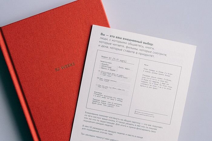 У нас появился ежедневник «52 weeks», для подведения итогов недели. Тканевый переплет алого цвета, золотое тиснение, минималистичное оформление, пухлая дизайнерская бумага приятно впитывает любые чернила и три шелковые закладки для удобной навигации в разных частях ежедневника.