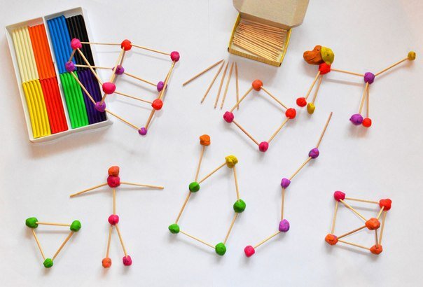 🔴⬜🔶🔷 Что нам понадобится для занятия: ⚪пластилин ⚪зубочистки Простая занимашка, которая очень многое даёт - развивает мышление, усидчивость, мелкую моторику, воображение. Ребенок изучает и вспоминает геометрические фигуры и тела Из пластилина вместе с ребенком катаем шарики. За счёт них будут держаться зубочистки, которые нужны для моделирования геометрических фигур и тел. Дальше покажите ребенку как при помощи пластилиновых шариков и зубочисток можно соединять и делать фигуры. Для начала лучше делать 2D модели, постепенно усложняя конструкции.