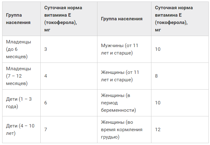 Как известно, витамин Е (токоферол) является жизненно важным для любого организма. Именно от него зависит наша защита от разрушающих факторов внешней среды. Когда клетки, ткани и органы ежедневно получают достаточное количество токоферола, уменьшается риск развития многих заболеваний, а также замедляются темпы старения организма. Итак, какова суточная норма витамина Е? В каких случаях потребность в нем повышается? Сколько нужно принимать витамин Е при беременности? Обо все этом Вы узнаете ниже. Таблица. Суточная норма витамина Е 1 мг приблизительно равен 1 МЕ (Международная единица, в которой измеряются жирорастворимые витамины). Таким образом, подведем итоги. Средняя суточная норма витамина Е составляет 10 – 20 мг. Важно заметить, что потребность в витамине Е зависит от пола, возраста, индивидуального состояния организма. А также от уровня жизни и степени подверженности вредным факторам внешней среды. К вредным факторам относятся не только ядовитые вещества, поступающие извне, но и