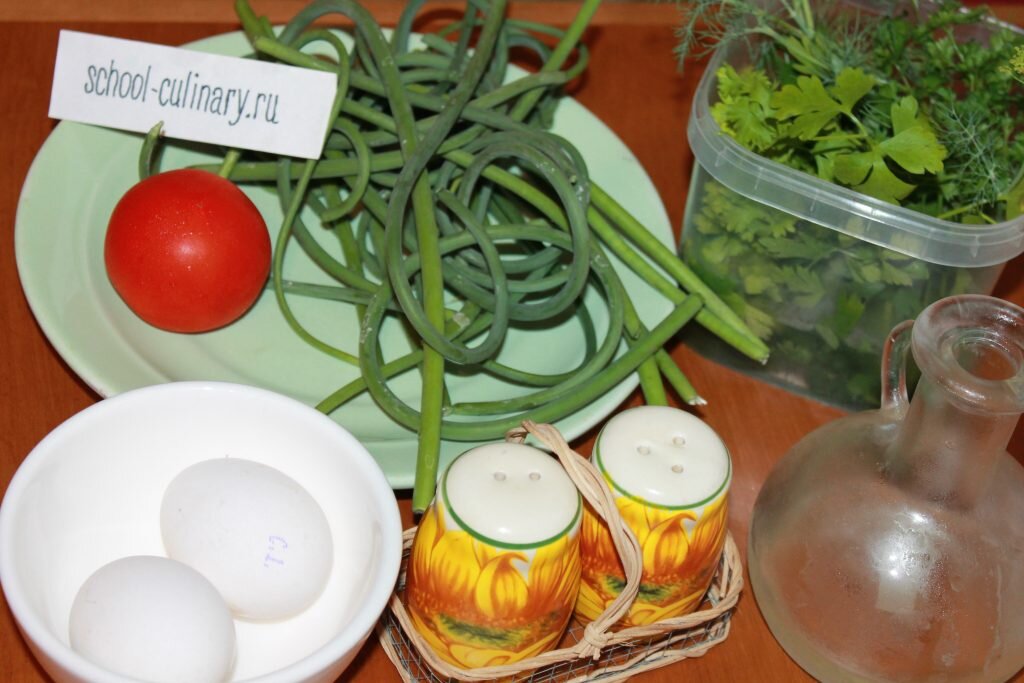 Чесночные стрелки, жареные с яйцом, - необычное блюдо для разнообразия домашнего меню. Как правило, стрелки, которые появляются на чесноке в период созревания растения, хозяйки отрывают и выбрасывают. Но это неправильно. Ведь побеги имеют пикантный вкус и узнаваемый аромат. И приготовить их можно разными способами. В них содержится большое количество витаминов и микроэлементов, повышающих иммунитет. Кушанье с применением нетрадиционного компонента выходит сытным и ароматным. Пора пробовать. Ингредиенты: чесночные стрелки – 300 г; помидор – 1 шт.; яйца куриные – 2 шт.; петрушка, укроп – 20 г; соль, специи – по вкусу; масло растительное – 1 ст. л. Приготовление Чесночные стрелки, которые еще не цвели, срываем, удаляем бутоны. Хорошо моем. Помидор ополаскиваем. Побеги нарезаем кусочками по 3 см длиной. В сковороду наливаем растительное масло и выкладываем подготовленное сырье. Ставим на огонь и включаем средний нагрев. Жарим 5-7 минут, помешивая. Степень обжарки зависит от предпочтений