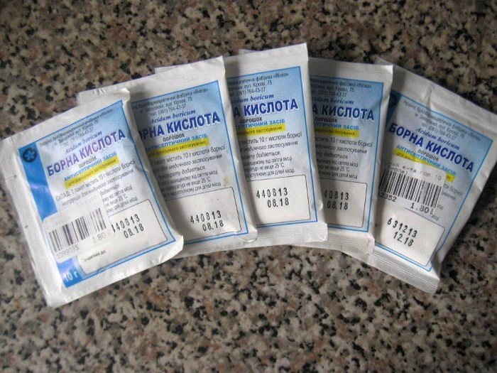 Рецепт: 0.5 л горячей воды + 2 г. ортоборной кислоты. Тщательно размешиваем и вливаем в 10-литровое ведро теплой воды. Опрыскиваем растения из пульверизатора вечером или в пасмурный день.