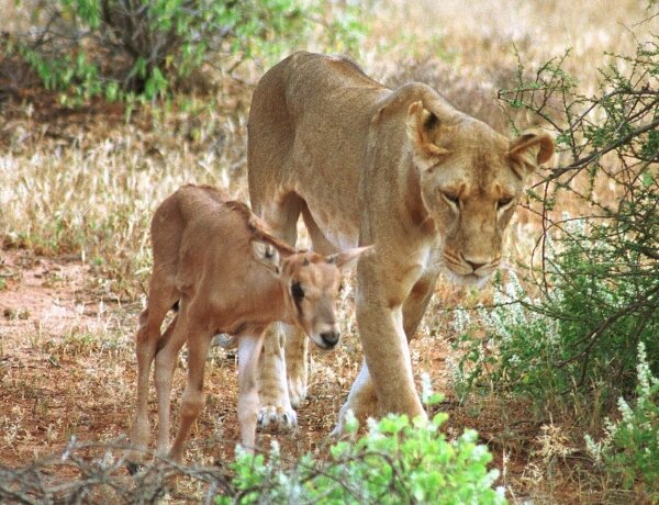 В декабре 2001 года работники Национального заповедника Самбуру в Кении наткнулись на удивительную картину: взрослая львица разгуливала с детёнышем антилопы орикс. К слову, ориксы – это одно из любимых блюд для больших кошек, так как они меньше своих собратьев и их достаточно просто поймать. Львица, которую работники по понятной им одним логике окрестили Ларсенс, спугнула мать маленького орикса. Та, не задумываясь, ускакала от опасности, как и любая адекватная антилопа. Но вместо того, чтобы погнаться за убегающей добычей или, на худой конец, полакомиться нежным мясом детёныша, львица решила забить на логику и вырастить орикса, как своего собственного ребёнка. С точки зрения удочерённой антилопы, ситуация складывалась более чем удачно. Иметь львицу в качестве мамы – это, безусловно, круто. А когда к этому прилагается ещё и неплохая защита от хищников, то ситуация становится ещё лучше. В Африке вообще не так-то просто выжить, даже если ты и не новорождённая антилопа. Так что защитниц