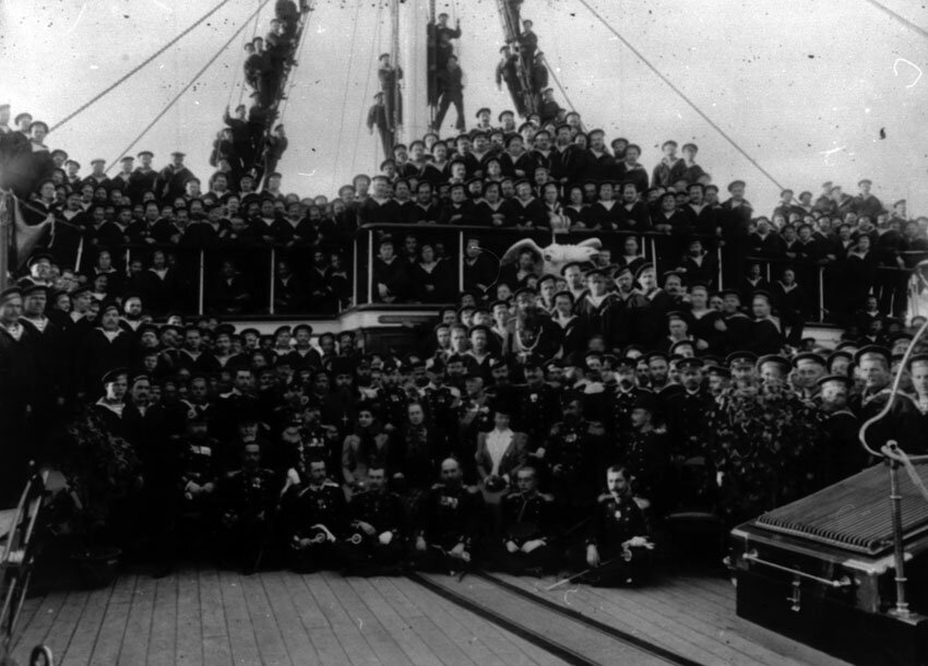 Фотография офицеров и нижних чинов броненосного крейсера 1 ранга "Память Азова" с высокой Гостьей крейсера. Судя по ряду признаков - это Королева Эллинов Ольга Константиновна , но надо бы уточнять. Фото сделано на корме корабля , беред кормовой рубкой. Имеет прикладной интерес для судомоделистов то , что достаточно хорошо видна фигура орла на рубке - во всех чертежах крейсера отсутствует этот элемент украшения. К сожалению ... фигуру создавали не флотские специалисты , а мастера Академии Художеств и во флотских архивах нет документации. По рубке ещё шли декоративные элементы с названиями мест побед русского флота во времена службы парусного "Азова" - давшего крейсеру имя и гвардейский флаг. Вот эти "плакетки" вовсе не известны и их качественных изображений не найдено до сих пор. Ко времени достаточно массовой фотографии корабля ... он лишился имени , гвардейского флага и всех элементов горделивого декора вместе с честью - всё за измену Родине и Присяге в форме террористического мятежа