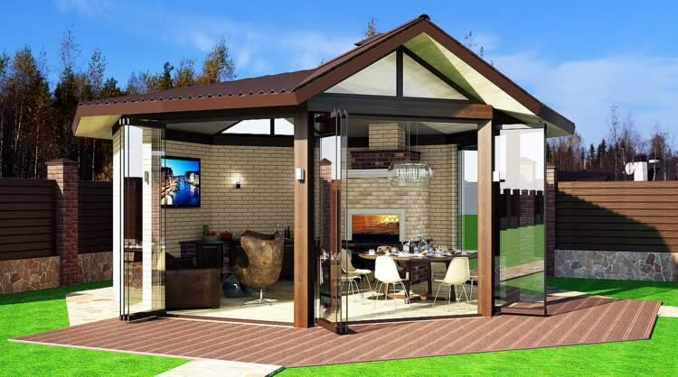 Загородный участок или дачу прекрасно дополнит беседка, оборудованная мангалом. Она просто незаменима для любителей отдыха на свежем воздухе и приготовленной на открытом огне пищи. Мангальные конструкции внутри беседок могут быть укомплектованы: Выбор вида беседки зависит от материала изготовления, ландшафтного дизайна участка, предпочтений хозяина. Сооружения должны гармонично вписываться в общий стиль дома и сада. В качестве материала для изготовления беседок с мангалом или барбекю наиболее часто используют камень или кирпич, древесину, металл. Преимущества конструкций из дерева Этот натуральный материал органично вписывается в любой экстерьер. Такие постройки отличаются привлекательным внешним видом, а дополнение садовой мебелью и печью в русском стиле сделает крытые беседки с мангалом функциональным сооружением. Благодаря природным особенностям древесины постройки из этого материала теплые, а если конструкцию еще и застеклить, то помещение подойдет для использования в холодное врем