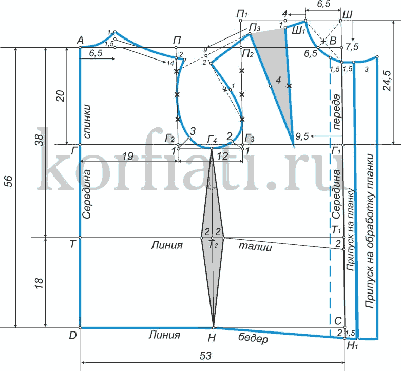 Чертеж приведенной выкройки блузки соответствует 48-му размеру.