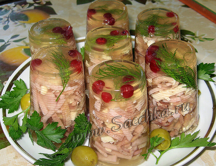 Заливное приготовлено в одноразовых стаканчиках из курицы, ветчины и языка. Ингредиенты: Как приготовить: P.S.: И вот когда все это дело вынимается, то получаются очень красивые столбики - такое украшение холодных закусок.