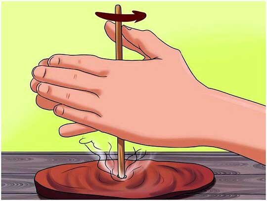 Далее нам нужно найти дощечку или тонкий кусок дерева, где необходимо ножом (или любым другим острым предметом) проделать небольшое углубление для сверла. Какое такое сверло, спросите вы, верно? Да обычная сухая палочка, конец которой мы вставим в то самое углубление. А теперь достаем тот самый кусочек коры о котором я говорил в предыдущем абзаце. Его нужно положить под дощечку в том месте, где вы проделали углубление.