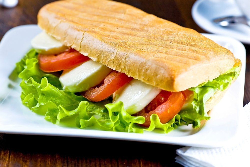 Хлеб или лучше панини надо смазать оливковым маслом, предварительно перемешанным с базиликом и с другими специями, подобранными по вкусу. Кладем листок салата, нарезанный кружочками томат и ломтик моцареллы. После этого слои накрываются еще одним хлебным ломтем или второй половинкой панини и разогреваются так, чтобы сыр успел расплавиться, но не превратиться в массу, по консистенции похожую на каучук.