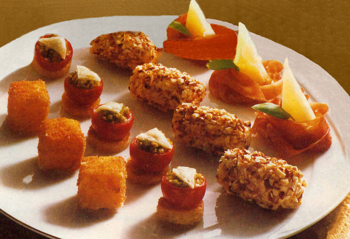 На большую тарелку выложить все получившиеся закуски: сырные кубики, маленькие фаршированные помидорки черри, сырные крокеты и тартинки с окороком.