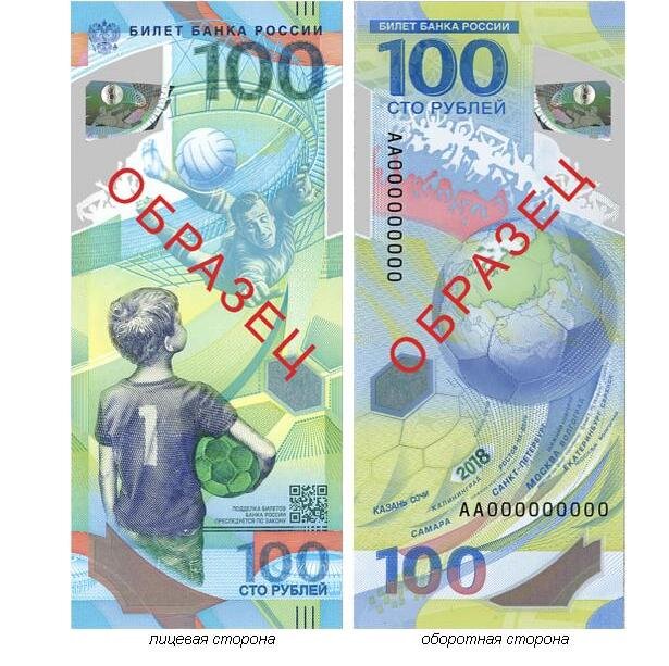 Банкнота номиналом 100 рублей, посвящённая чемпионату мира по футболу, появилась в отделениях банков, сообщили ИА «ИрСити» 21 июня в пресс-службе Сибирского отделения Банка России. «На лицевой стороне банкноты изображён мальчик с мячом, мечтающий повторить подвиги Льва Яшина - знаменитый футболист представлен в прыжке к мячу. Впервые на рублёвой банкноте изображён реальный человек, не являвшийся руководителем государства», - отмечается в сообщении. Банкноты активно распределяют по отделениям банков России. О наличии необходимо заранее уточнять в выбранном банке. Общий тираж около 20 миллионов экземпляров. На оборотной стороне – футбольный мяч, под которым написан перечень городов где проходит чемпионат мира по футболу. Также на купюре есть QR-код, по которому можно перейти на страницу сайта Банка России с описанием защитных признаков.
