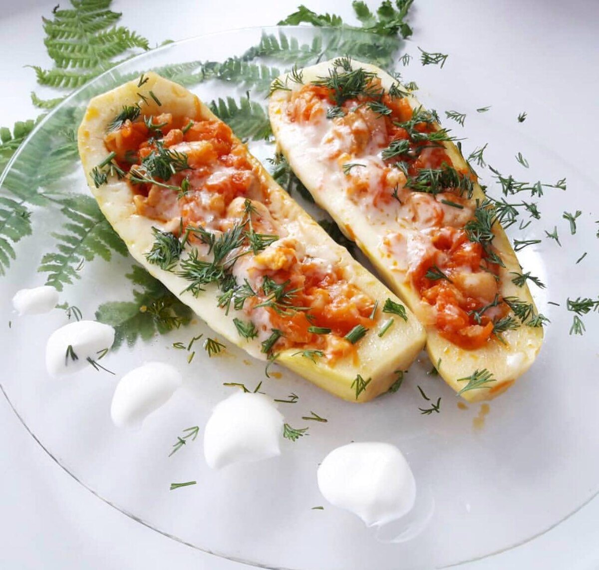 Сочное, вкусное и полезное блюдо, приготовить которое не составить труда даже для начинающих кулинаров. Порций - 6 (150 гр.) КБЖУ (на порцию) - 180.0/25.3/5.8/5.6 Ингредиенты ПРИГОТОВЛЕНИЕ 1. Куриное филе промыть водой, высушить и нарезать небольшими кубиками. 2. Помидоры вымыть, высушить и так же нарезать кубиками. 3. Кабачки вымыть, высушить, разрезать на две части вдоль. Вынуть серединку ложкой и порезать ее кубиками. 4. Морковь почистить, вымыть и натереть на крупной терке. 5. Все смешать в одной миске. Добавить мелко нарезанный лук, перепелиные яйца, соль, перец. Все тщательно перемешать (лучше руками). 6. Для соуса: смешать сметану и натуральный йогурт, добавить чеснок, зелень и сыр, натертый на крупной терке. 7. Добавить получившийся соус к куриному филе. Тщательно перемешать. 8. Выложить получившуюся смесь в лодочки из кабачков. 9. Запекать в течении 35-40 минут в разогретой до 180 градусов духовке. СОВЕТ К РЕЦЕПТУ Если в духовке есть гриль - на пару минут включить в конце