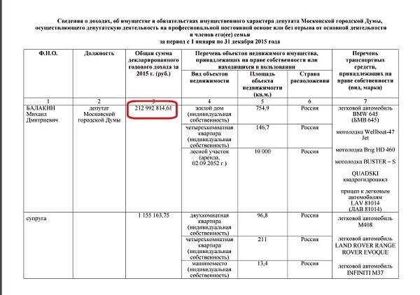 И вот еще одна странность, на которую почему-то ни мэрия Москвы, ни правоохранительные и контролирующие органы не пожелали обратить свое высокое внимание. Как было сказано выше, к началу 2015 года контора гражданина Балакина «СУ-155», ранее получившая более 68 миллиардов рублей авансов из бюджета, остановила строительство четырех жилых микрорайонов по причине… отсутствия денег и грядущего банкротства. И именно за 2015 год Михаил Балакин, совершенно не стесняясь и никого не боясь, вдруг совершенно официально задекларировал доход почти в 213 миллионов рублей. И в качестве дополнительного бонуса занял депутатское кресло в Московской Думе.