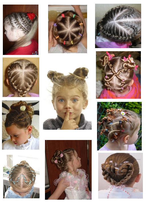 Несколько хвостиков, собранных в затейливый рисунок на голове достаточно быстро сооружаются и вызовут восторг у юной модницы. Кстати, таким образом можно заплести тонкие косички или скрутить небольшие жгуты. Чем больше экспериментов, тем удачнее прическа.
