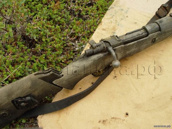 Найденный в воде копателями немецкий карабин маузер в удивительной сохранности для предмета пробывшего в воде почти век. Все металлические части отлично сохранились, деревянный приклад тоже, но немного усел в размерах. Karabiner 98k или как еще его обозначают - Kar98k или просто K98k, принят на вооружение вермахта в 1935 году. Являлся основным и самым массовым стрелковым оружием немецкой армии во Второй мировой войне. По сути является укороченной и незначительно изменённой версией винтовки Mauser образца 1898 года После промывки, без какой либо чистки или обработки затвор легко выдвигается. На фото виден даже не потемневший патрон с латунной гильзой, который все эти года находился в патроннике Вид спереди, видны нарезы внутри ствола Стилизованный имперский орел выдавленный на прикладе карабина. Это клеймо WaffenAmt, военной приемки, аналог советского ОТК. Такие клейма ставились на всех военных изделиях, как на металле так и на коже и дереве
