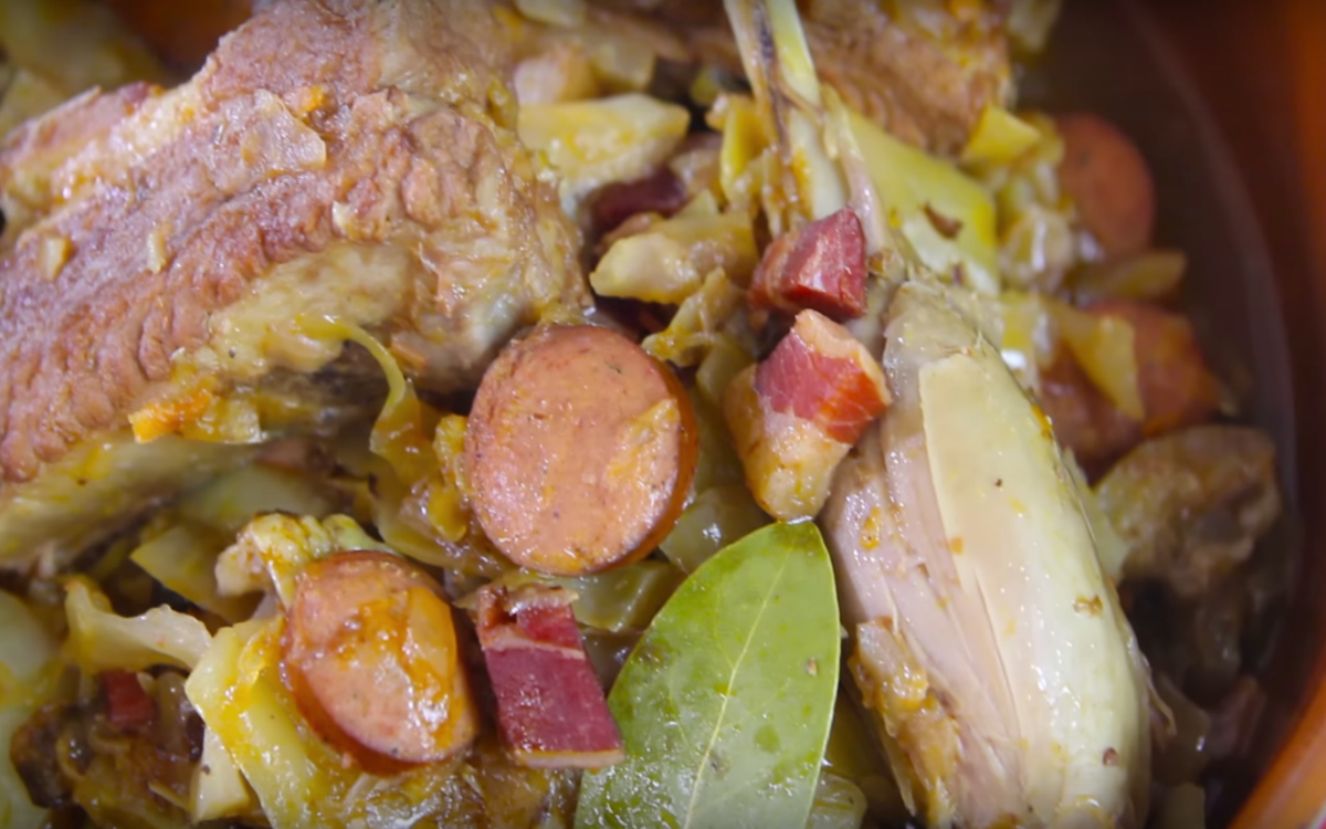 - рёбрышки свиные - бекон копченый - сосиски - тушеная утка - капуста свежая - капуста квашеная - лук - вино красное сухое - яблоко - чернослив - томатная паста - лавровый лист, тмин, кориандр, перец, соль