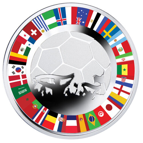 Монетный двор Польши радует всех футболистов-нумизматов новой серебряной монетой, отчеканенной по эмитенту острова Ниуэ. Нумизматический продукт выпущен по случаю Кубка мира по футболу, который стартовал совсем недавно на территории Российской Федерации. На реверсе изделия имеются элементы, выполненные в цвете и рельефе. Номинальная стоимость составила 1 новозеландский доллар(1 новозеландский доллар = 43.4486776 российских рубля по состоянию на 22.06.2018) Среди особенностей монет Ниуэ подчеркнем: • Отличный вариант подарка для поклонников футбола; • По окружности на реверсе появляется цветной круг с флагами стран-участниц Чемпионата мира по футболу; • Использовано серебро высшей пробы; • Элегантная упаковка в форме рамки. На реверсе футбольной монеты в центре изображен мяч, форма которого обрезана и напоминает географические очертания России. По окружности расположен круг из цветных флагов стран-участниц XXIV Кубка мира. На аверсе в центральной части изображен портрет Елизаветы