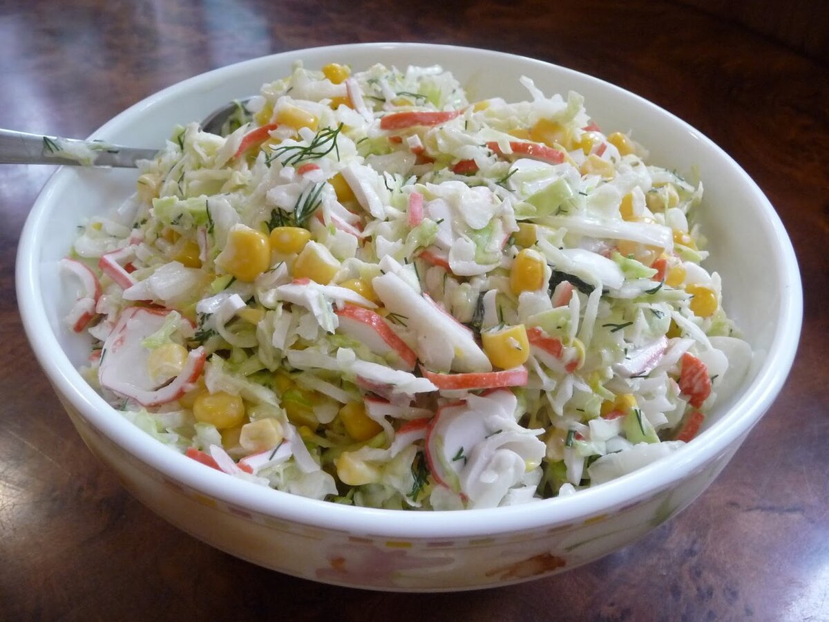 соль по вкусу Приготовление: 1. Подготовьте ингредиенты: яйца сварите вкрутую, слейте жидкость из кукурузы, очистите и промойте зелень и овощи. 2. Тонко нарежьте пекинскую капусту, положите в большую миску, приправьте солью и отставьте в сторону. 3. Нарежьте кубиками огурец (если кожица жесткая – удалите ее) и добавьте в салатник. 4. Очистите и нарежьте яйца, добавьте в салатник. 5. Добавьте кукурузу. 5. Нарежьте крабовые палочки небольшими кусочками и также добавьте в салатник. 6. Добавьте мелко нарезанный лук и нарезанный укроп. 7. Все смешайте, заправьте майонезом и подавайте. Приятного аппетита!