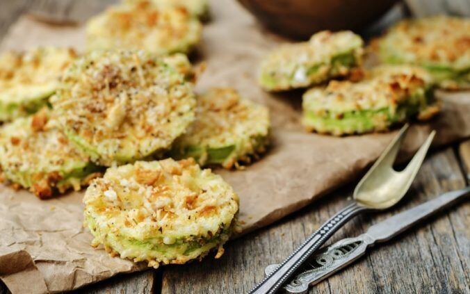Готовить это блюдо — очень просто и главное быстро. Кабачки-чипсы — как семечки. Ешь их и ешь, и не можешь остановиться. Займёт это от силы десять минут, а понадобится всего ничего: кабачки или цуккини (чем меньше — тем лучше) — 3 шт.; яйца — 3 шт.; хлебные крошки — 2 горсти; соль, перец — по вкусу; тертый пармезан — по желанию; растительное масло — для жарки. Кабачки хорошенько моем, вытираем, нарезаем кружочками толщиной с мизинец(желательно). Присыпаем кружочки солью и перцем. В миске взбиваем яйа с щепоткой соли и перца. На плоскую тарелку насыпаем хлебные крошки (они же — панировочные сухари). Если есть пармезан, можно перемешать его с панировкой. Обмакиваем кабачки сначала в яйцо, затем в хлебно-сырные крошки. Выкладываем на раскаленную и смазанную маслом сковороду. Жарим с двух сторон до золотистого цвета. Подаём сразу, едим горячими — просто так или с любимым соусом. При подаче лучше выложить на салфетки или какой-то красивый коричневый крафт: бумага заберет лишнее масло.