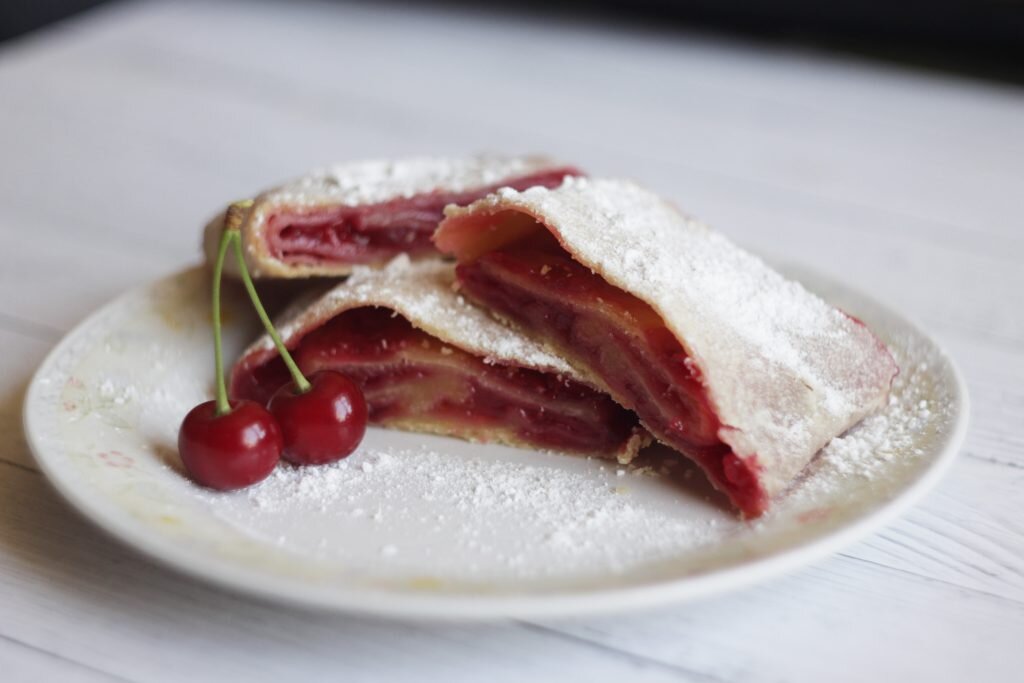 Теперь у нас по сезону вишня. И в этом году ее много! И кроме всего прочего, место, где я живу, в народе называется Вишневая балка. Аппетитно) Поэтому я решила приготовить вишневый штрудель. Тесто очень простое (из этих ингредиентов получается 4 средних рулетика): Начинка: Готовим тесто: Как обычно - смешиваем сухое с сухим. В муку добавляем соль Яйцо перемешиваем с водой и маслом. Переливаем жидкое в сухое и начинаем замешивать тесто. После того, как оно начнет отставать от рук, формируем из него шарик. Тесто должно немного отдохнуть при комнатной температуре, минут 40. В это время можно приготовить начинку: почищенную от косточек вишню засыпаем сахаром, ставим на огонь и доводим до кипения. Потом высыпаем туда крахмал и ждем загустения. Дождались? Остужаем и снова ждем. Тесто я делю на 4 части, беру одну часть и раскатываю тоненько. тесто нужно смазать растопленным сливочным маслом перед тем, как укладывать начинку. Начинку кладу в середину и распределяю, делая отступ см 2 от краев