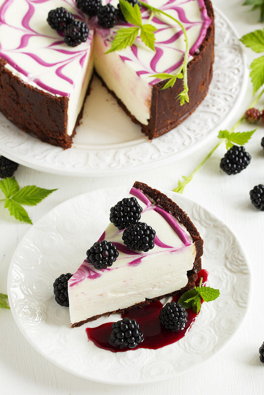 - Желатин прогреть, чтоб растворился и смешать с небольшим количеством крема и потом эту малую часть соединить с остальным. Отложить в сторону 2 ст л крема и смешать с 1-2 ст л ежевичного сока. Крем переложить в охлажденную основу, разровнять. По желанию внутрь можно положить ягоды ежевики. Сверху нанести рисунок ежевичной смесью.