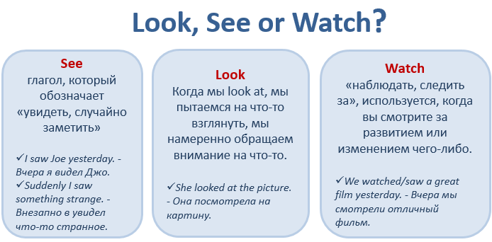 Неумение правильно использовать и отличать три глагола «see», «look» и «watch» — одна из самых распространенных ошибок моих студентов. Этот пост призван помочь разобраться в различиях между данными словами. Для начала короткое определение каждого из слов: SEE — видеть Видеть в буквальном смысле — не быть слепым, быть в состоянии что-то увидеть LOOK — смотреть Направлять свой взгляд на что-то и смотреть на это WATCH — наблюдать Наблюдать за чем-то, следить за каким-то процессом Теперь более подробно о каждом слове с примерами: SEE значит видеть что-то или кого-то, что появляется у нас перед глазами. То есть человек может видеть (see), если у него открыты глаза и он зрячий. Глагол see более пассивный, мы воспринимаем то что нам показывают, но не проявляем активных действий, чтобы специально взглянуть на что-то. I see people on the street — Я вижу людей на улице (я специльно не смотрю на них, но я нахожусь на улице, они проходят мимо, поэтому я их вижу) LOOK (AT) означает сознательн