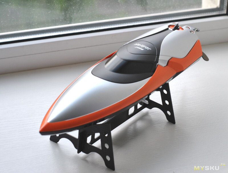 Добрый день, уважаемые читатели. Продолжаю рассматривать недорогие радиоуправляемые игрушки. На повестке дня лодка. Я уже обозревал похожую модель JJR/C S3, они как братья близнецы, но комплектации совсем разные. Посмотрим, какую лучше взять. Но обо всем по порядку. Доставка ТК, но довольно долгая. Коробка в расцветке финишного флажка: Сзади основные характеристики Внутри коробки пенопласт — лучшая защита от транспортных повреждений: Характеристики helifar H106: Основной цвет: серебристый и оранжевый Частота управления: 2.4 ГГц 4 канала Дистанция управления: около 150 м Максимальная скорость: 25 км/ч Аккумулятор: 7.4 В 600 мАч 2 шт. в комплекте Время зарядки: около 2 ч Время работы: около 8-10 мин Питание пульта: 4 * AA 1.5 В батарейка Размеры: 352 * 92 * 90 мм Масса: около 340 г Комплектация игрушки: Сразу обращается на себя внимание аппаратура со стиками (не пистолетная) и пара аккумуляторов (один уже в лодке). В остальном все типовое: лодка, пластиковая подставка, usb зарядка, ЗИП