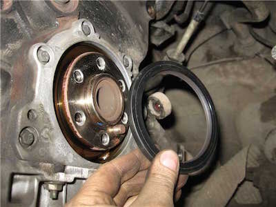 В этом случае уплотнитель просто выдавит из посадочного гнезда, причем, не важно, новый он или уже изношен. Так образовывается люфт между уплотнителем и коленвалом.