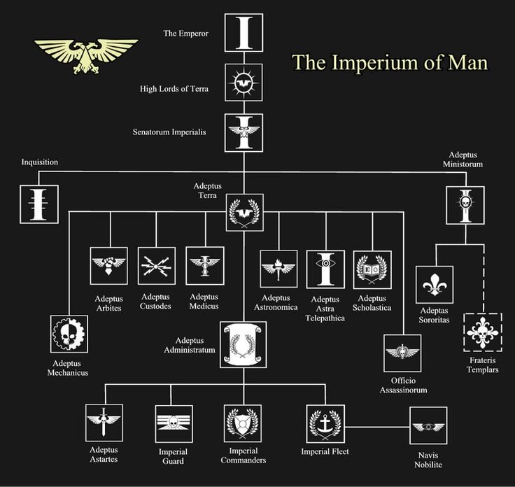 Империум это государство объединившее большинство человеческих колоний и распростершееся на 2/3 галактики. Номинально правителем этого мега государства является Бог Император человечества, который уже 10 тысяч лет восседает на золотом троне. Императору, как богу, поклоняются по всей галактике и именно поэтому церковь посвященная ему является одной из самых могущественных организаций во всей галактике. На самом деле Империумом правят высшие лорды Терры, самые могущественные и влиятельные люди как в своей организации, так и во всем Империуме. По их воле могут быть санкционированы огромные военные компании, именуемые крестовыми походами, в следствии которых, перекраивается карта галактики и стираются бесчисленные расы чужаков, в состав каждого такого похода входят тысячи кораблей, бесчисленные миллиарды солдат и неисчислимо большее количество колонистов, и прочего вспомогательного персонала. Каждый мир в составе империума, должен платить имперскую десятину, которая обязывает мир отправ