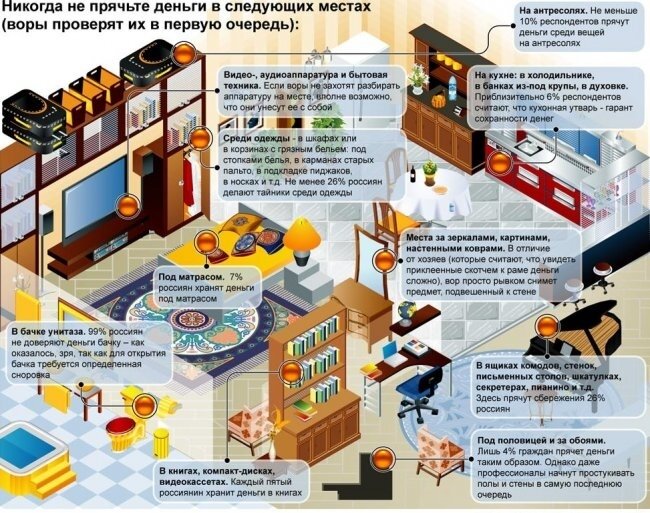 Какой бы чистой не была наша совесть, всегда найдется то, что хотелось бы спрятать подальше от любопытных глаз. Лучшим местом для хранения драгоценных вещей станет банковская ячейка или сейф. Но есть места, которые сохранят вашу тайну не хуже специализированной охраны. Ну, а для начала расскажем куда не стоит прятать то, что вам дорого. По данным социологов, к легкодоступным тайникам относятся: Если уж вы все-таки решили сделать в своем доме тайник, то советуем присмотреться к следующим вариантам. 1. Керамическая плитка Устроить такой тайник можно или на кухне или в сан. узле. Внешне такая плитка может немного выделяться, поэтому подумайте место, которое не будет сильно на глазах Чтобы сделать плитку-обманку, снимите одну плитку со стены в ванной, а затем проделайте дыру в стене за ней. Прикрепите к плитке маленькую коробочку и поставьте назад на стену. Только не забудьте, за какой именно плиткой хранятся ваши сокровища! 2. Розетка Мало кому придет в голову совать пальцы в розетк