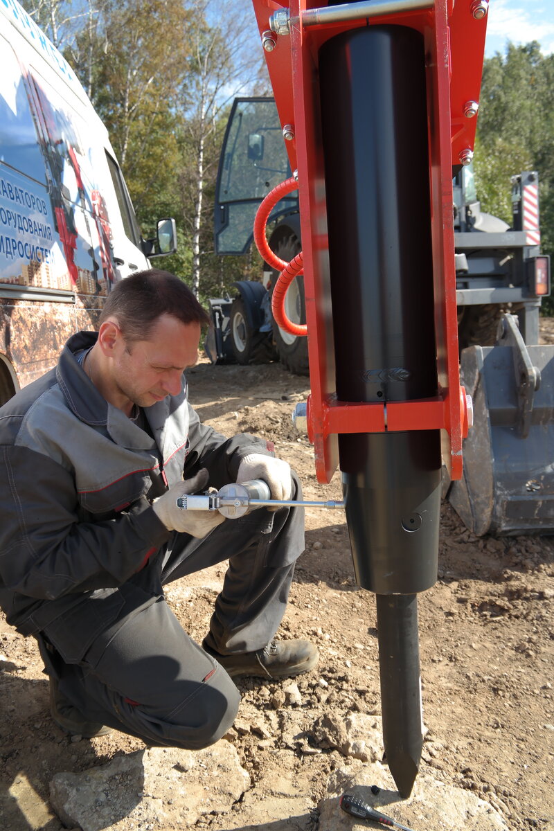 Подавляющее большинство операторов читает инструкцию по эксплуатации только тогда, когда уже возникла неисправность в работе оборудования. До этого момента устройство используется по наитию. И гидромолот не исключение. Даже Импульс-120 с простейшей, интуитивно понятной конструкцией может заканчивать свой ресурс до срока. И причиной тому — невнимательное отношение к оборудованию. При этом список операций по обслуживанию гидравлических молотов не так уж велик. Смотрите сами: смазка рабочего инструмента, заправка азотом, протяжка болтов. Базовая машина устанавливает его вертикально, поджимая пику к бойку. Это рабочее положение. Далее при помощи пресс-масленки в буксе, консистентной смазки Delta Marathon DM-3000 и шприца смазываем до тех пор, пока не увидим, как смазка течет между пикой и нижней втулкой. Эта процедура проводится 1 раз в 3 часа (а для обкатки нового оборудования — 1 раз в 2 часа). Что это дает? Это сохраняет максимальный ресурс гидромолота, помогает меньш