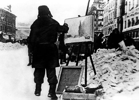 Посмотрите на первую фотографию. И ещё на следующую тоже. Вы поняли о чем это? На первой фотографии - художник рисует. Ничего не обычного, правда? Только вот это блокадный Ленинград. Зима 1942, самая суровая (было даже минус 40! Представляете, что это значит для Ленинграда?). А он рисует, да. И для него ТО время.
