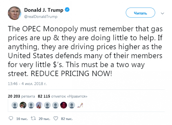 Вы давите на хороших парней из ОПЕК. Дискредитруете их и подрываете их суверенитет (стран). Из-за таких ваших твитов цена на нефть поднялась еще на 10 долларов (с) https://www.bloomberg.com/news/articles/2018-07-05/iran-says-trump-tweets-not-opec-are-driving-up-oil-prices
