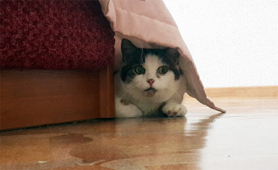 Долгое время он прятался по разным закоулкам квартиры — только ночами выходил поесть. До конца жизни он панически боялся незнакомцев: стоило зайти в квартиру кому-то постороннему — кот тотчас же на полусогнутых драпал за диван. Да что там постороннему! — от нас он тоже продолжал исправно таиться, хотя во время родительских отлучек не один раз подолгу живал у нас и вёл себя в эти периоды почти совсем как нормальный кот.