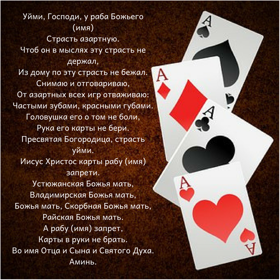 1. ЗАГОВОР ОТ КАРТ Нужно зайти в церковь первой, купить три свечи и поставить у иконы Спасителя (никогда не зажигайте свечи от рядом стоящих). В церкви возьмите Святую воду и идите домой ни с кем не разговаривая и не оглядываясь. Нашепчите на воду и используйте ее для игрока для еды и питья. 2. ЗАГОВОР ОТ АЗАРТНЫХ ИГР. Слова нужно прочитать над водой и обрызгивать ею игрока, не предупреждая. Всех вам благ!