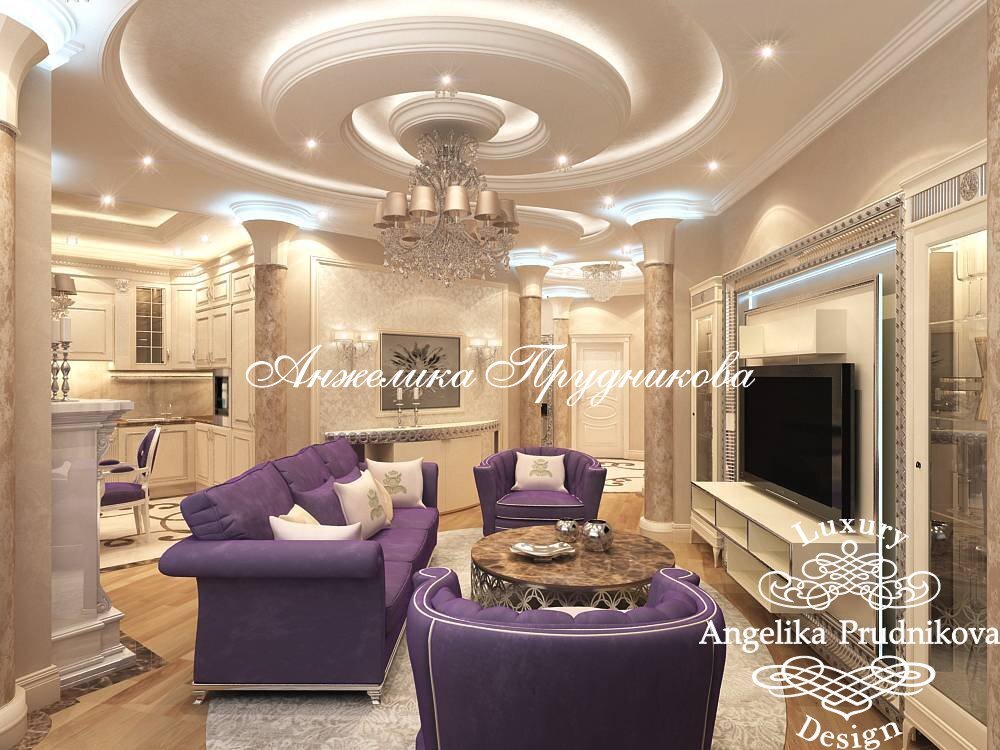 Благодаря эксклюзивной отделке в сливочно-бежевых тонах, которая стала прекрасным фоном для фиолетовой мягкой мебели, полам с изящными виньетками и итальянским люстрам ручной работы жилое пространство выглядит поистине роскошно.