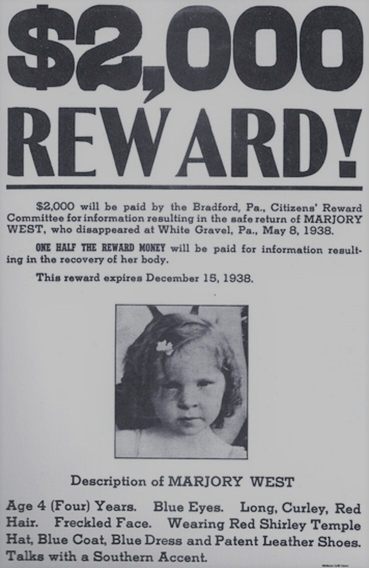 Никто не мог предугадать, что произойдет 8-го мая 1938 года. Четырёхлетняя Марджори Уэст со своими родителями и старшей сестрой Дороти отправилась на пикник в День Матери. Сёстры отлучились от родителей, чтобы нарвать цветов, но Дороти решила вернуться на пикник раньше и оставила свою сестру одну. Когда она вернулась на место, где они были вместе, Марджори уже нигде не было найти. Позже тем вечером водитель такси сообщил, что он видел озабоченную девочку, по описанию похожая на Марджори. Она ехала в зеленом фургоне с неизвестным мужчиной. Тот интересовался у водителя такси, есть ли где-нибудь поблизости отель. Таксист ответил, что в ближайшей гостинице не было свободных комнат. Фургон был позже замечен на заправочной станции километрами дальше. По сообщениям очевидцев, девочка была окутана в одеяло, а спинка кресла опущена почти до предела. Настоящие детали пропажи Марджори остались неизвестны. Однако, многие люди с тех времен строили предположения, что детей похищали для организац