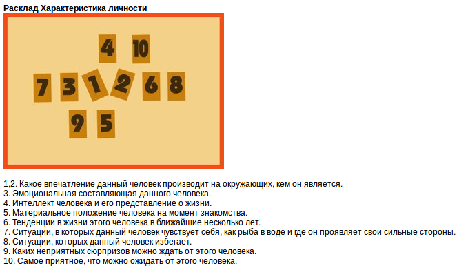 Кверентка: А сможешь на самопознание/работу /призвание, что то из этого разложить? Я: Да, конечно. Скинуть соответствующие подборки? Кверентка: Угу. Я: Самопознание, 11 страниц. Бизнес и работа, 6 страниц. Кверентка: Вот этот Я: Готов делать, единственное, что здесь надо оговорить - он довольно широкий. Мне придется уменьшить масштаб в редакторе до 75%, и карты несколько потеряют выразительность. Кверентка: Не страшно, главное значение. Я: Делаю. Я: Сделал и готов читать. Кверентка: И я. Я: Хорошо, приступим. П.1, какое впечатление ты производишь на окружающих - Вина. Человека страдающего, эмоционально угнетенного? Кверентка: Хм. Видимо. Многие знают про мои проблемы. Я еще и канал веду, где периодически ною. Я: П.2, кем на самом деле являешься - Цветение. Есть некое здоровое и даже цветущее ядро личности. Кверентка: Ой. Ура. Хотя интересно. Я: П.3, эмоциональная составляющая - Молчание. Есть подавленные эмоции, может быть, алекситимия. Кверентка: А что это? Я: Трудность с распознавани