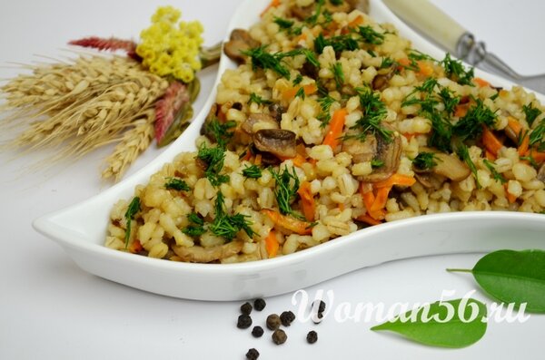 К перловой каше многие относятся с предубеждением, это блюдо считается исконно «армейским», поэтому ассоциируется только с галетами и тушенкой. Если говорить о классических рецептах, то перловка со сливочным маслом разочарует своей ординарностью. Удивительно, но перловка лучше всего проявляет себя в постных блюдах. Понадобится всего парочка овощей и горсть грибов, а результат получится превосходным. Ингредиенты рецепта: Приготовление перловой каши на воде Если есть выбор, то нужно взять самую светлую перловку. Предварительное замачивание крупы приводит к усилению вязкости каши. Выигрывая в скорости, мы можем проиграть в качестве. Перловку несколько раз промывают прохладной водой. Крупу солят, заливают водой. Время кипения - 1 час, пену периодически снимают. Перловку варят под крышкой на медленном огне. Можно оставить средний огонь, но тогда придется следить за уровнем жидкости, доливая воду время от времени. Если не планируете добавлять овощи, то дождитесь мягкости круп