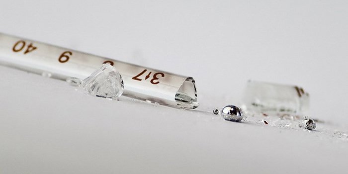 Разбился градусник: опасно ли это Обращаться с термометром следует аккуратно, так как достаточно одного неловкого движения и даже слабого удара, чтобы его корпус треснул. Прибор нужно хранить в недоступном для детей месте и в специальном защитном чехле. Если по какой-либо причине ртутный градусник разбился, нужно немедленно принять соответствующие меры, т. к. жидкий металл начинает улетучиваться при температуре 18°С, а пары его крайне опасны для здоровья. При небольшом объеме токсичные испарения ртути попадают в организм человека в основном через легкие. Если объемы этого вещества большие, то отравляющие вещества могут попадать в организм через кожу и слизистые оболочки. Степень отравления организма парами ртути зависит в первую очередь от объема вещества и состояния здоровья. Так, взрослый человек с крепким здоровьем после пребывания в помещении, где был разбит термометр, может почувствовать только небольшое недомогание. Человек со слабым здоровьем или ребенок рискуют получить остро