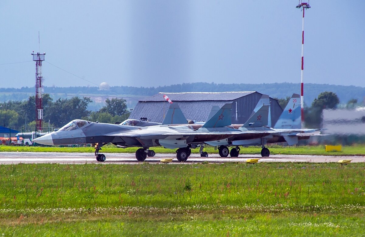 Истребитель пятого поколения Су-57 в нашей стране "родился" не очень давно, первый полет - в 2010 году. При этом для машины постоянно велись доработки, касающиеся как планера, так и (самое важное) двигателя. Раскрою страшный секрет (Полишинеля) - на первых образцах стояли совсем не те двигатели, с которыми самолет должен идти в серийное производство. А раз Министерство обороны уже заказало первую партию для закупки в войска, можно осторожно сделать вывод - двигатель второго этапа (то есть тот, который долго разрабатывали) - готов. 1. На МАКСе-2017 самолет еще не назывался Су-57, он "выступал" под "псевдонимом - Т-50. И работали российские "стелсы" в паре - сначала пилотаж, а затем и ученый бой друг против друга. Взлет пары "Тэшек". 2. Ведущий в паре - заслуженный летчик-испытатель, Герой России - Сергей Богдан. Это его машина с бортовым номером 51. 3. Пара работала сначала в группе с Су-34 и су-30, а затем, после эффектного роспуска... 4. ... "Сухие" прошли парой над зрителями и устрои