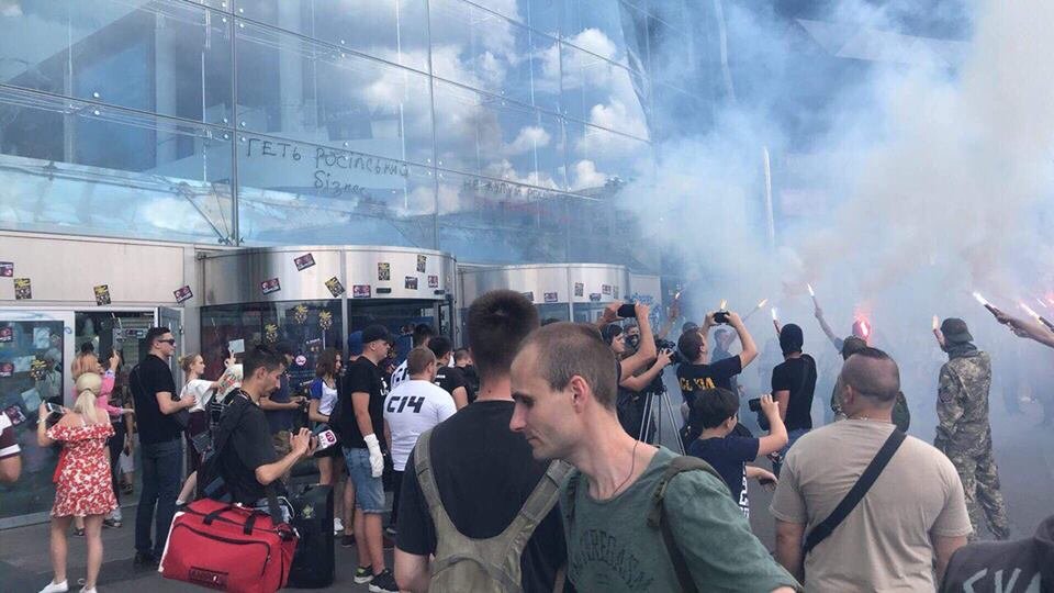 В пятницу, 6 июля, националистические организации "C14" и "Сокiл" вышли на акцию протеста к торговому центру Ocean Plaza. Об этом в своем фейсбуке сообщил Дмиртий Сиркович. "Акция против российского бизнеса в Украине", - сообщил он. По словам активистов, они вышли с протестом к торговому центру, который принадлежит российской компании "ТПС Недвижимость", контролируемой в том числе дочерью Аркадия Ротенберга, Лилией. Участники акции окружили здание ТЦ, зажгли файеры, а двери и окна "Оушен Плазы" обклелили наклейками и разрисовали краской из баллончиков. "ТПС Недвижимость", контролируемая в том числе дочерью Аркадия Ротенберга, Лилией, недавно заявили, что готовы свернуть свой бизнес в Украине и продать торговый центр Ocean Plaza (площадью 165 тыс. кв. м) в Киеве.