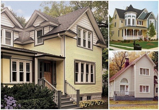 Обшивка дома из металлического сайдинга всегда выглядит аккуратно. Цвет сайдинга можно выбрать по каталогу. Но, металлический сайдинг, в отличие от винилового не имеет различных фактур. Выбор винилового сайдинга ограничивается только вкусовыми предпочтениями и финансовыми возможностями покупателей. Богатая цветовая гамма и многообразие фактур способны удовлетворить даже самые изысканные вкусы. Большой популярностью пользуются комбинированные «вкусные» цветовые решения: «фисташки-пломбир», «киви-банан», «халва-голубика» и др.