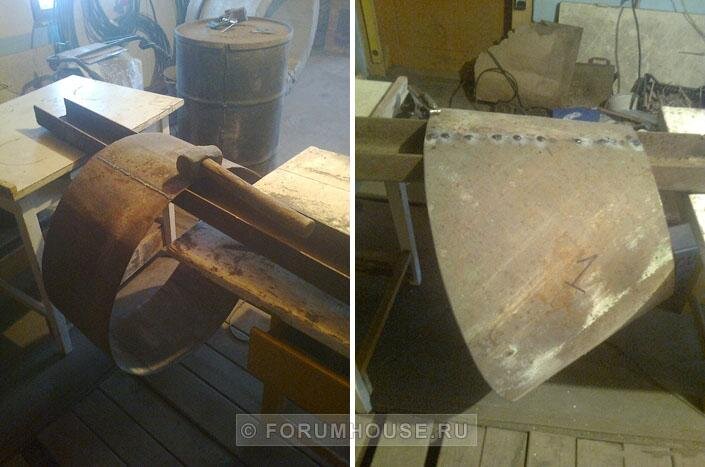 Кувалда – в правой руке, левая держит детали, вырезанные из металла толщиной 2,5 мм. Можно начинать! Все элементы будущей груши форумчанин довел до нужной формы на швеллере.