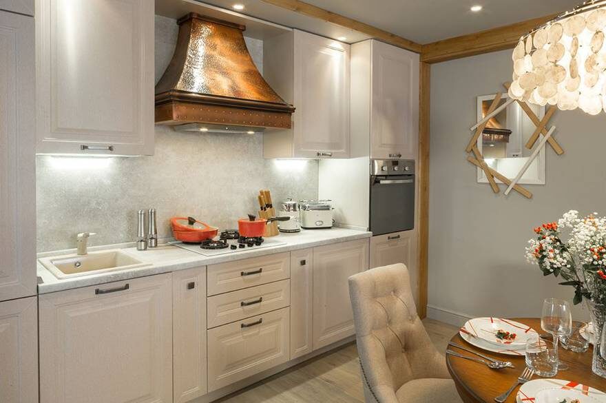 Д.А.: Одно из отличий дизайнерского подхода при проектировании кухни – свежий взгляд на использование различных материалов в декоре. Так, например, неспециалисту вряд ли придет в голову использовать в оформлении пространства изделия из меди. Между тем, этот металл позволяет облагородить интерьер, например, очень красиво смотрятся медные раковины, фасады на кухонных шкафах или плитка, которая может быть использована при отделке стен или укладке пола.