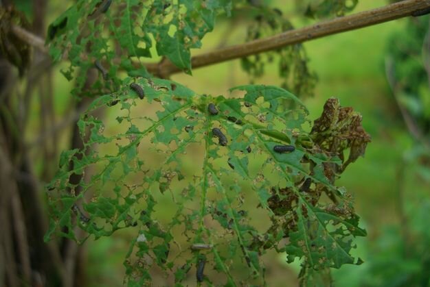 Калина обыкновенная и ее декоративные формы привлекают многочисленных вредителей. В этом сезоне садоводы жалуются на нашествие мелких гусениц, практически полностью уничтожающих листья. Виновник беды – калиновый листоед, специализированный вредитель, развивающийся и питающийся на калине. В начале мая из перезимовавших яиц отрождаются зеленовато-серые личинки длиной 7–11 мм, они питаются молодыми листьями, проедая в них дыры. В годы массового размножения вредитель может лишить листьев почти весь куст. В начале июня личинки уходят в почву и окукливаются, а спустя 3-4 недели выходят молодые жуки. Жуки обгрызают листовые пластинки, зеленые побеги и даже ягоды. В конце августа – начале сентября самки выгрызают цепочку отверстий в зеленых побегах и откладывают там кучками яйца. Такие побеги могут засохнуть уже осенью. Меры защиты Против калинового листоеда можно проводить две обработки. В мае-июне уничтожают личинок, а в августе-сентябре – жуков. Используют препараты «Искра», «Кинмикс», «Ф